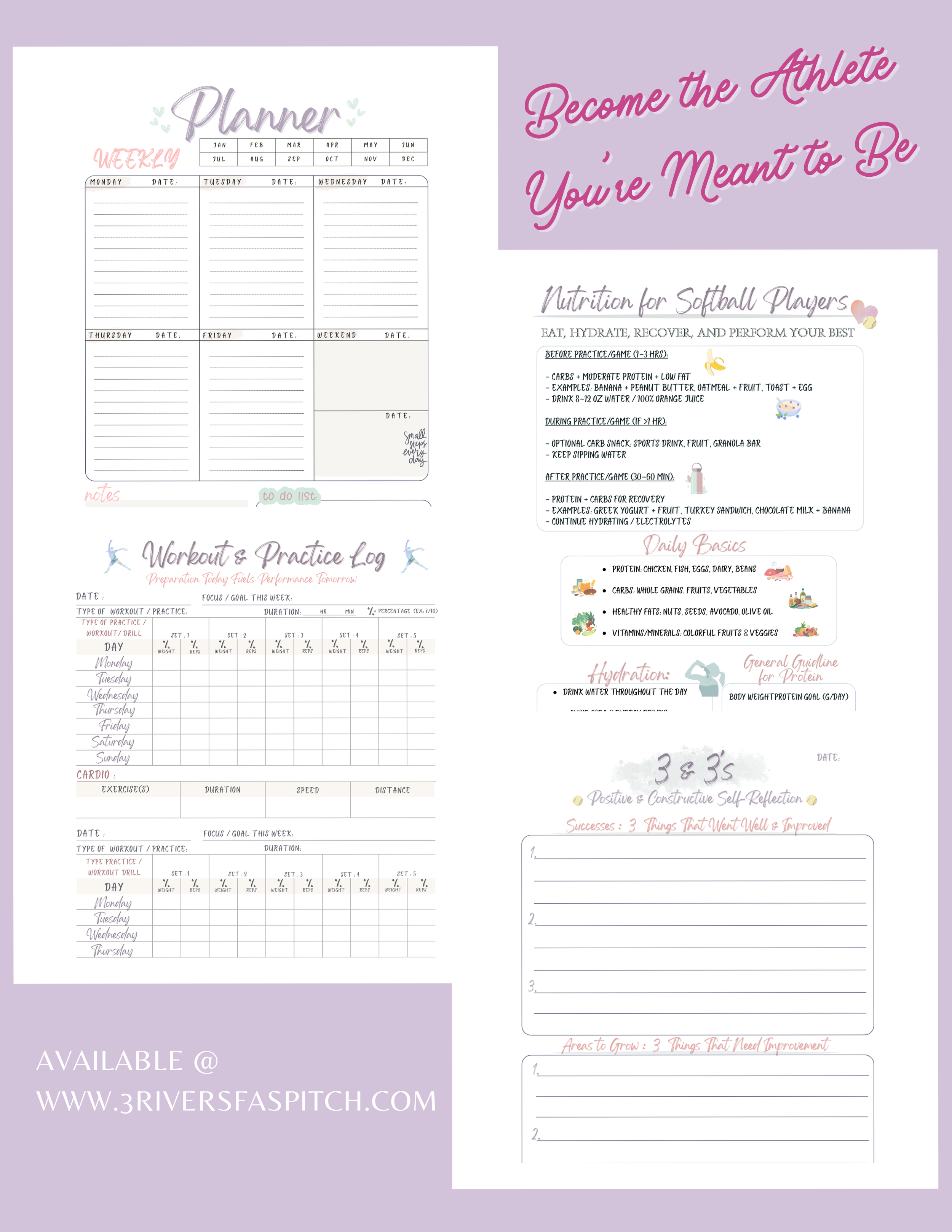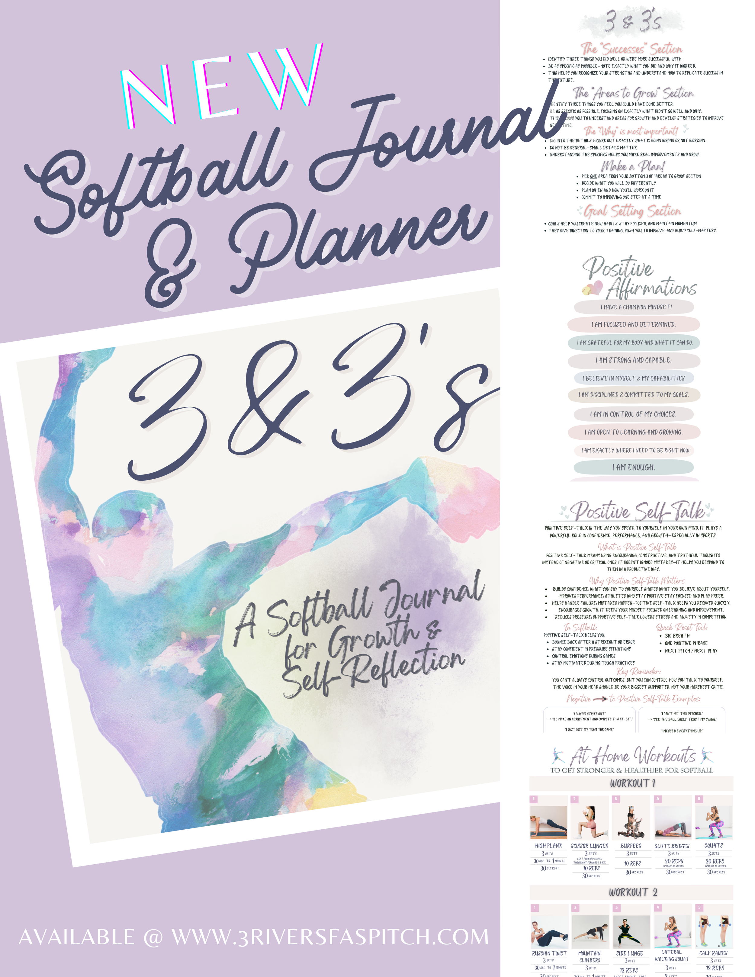 The 3 & 3’s Softball Journal is a guided journal that helps athletes reflect on their performance, track growth, and set actionable goals. Each day or week, players identify 3 successes and 3 areas to grow, then focus on one area to improve. With sections for workouts, nutrition, breathwork, and mindset, this journal builds confidence, accountability, and long-term habits—on and off the field.